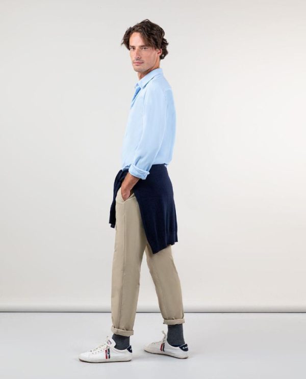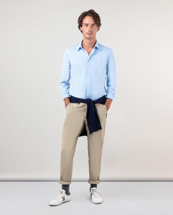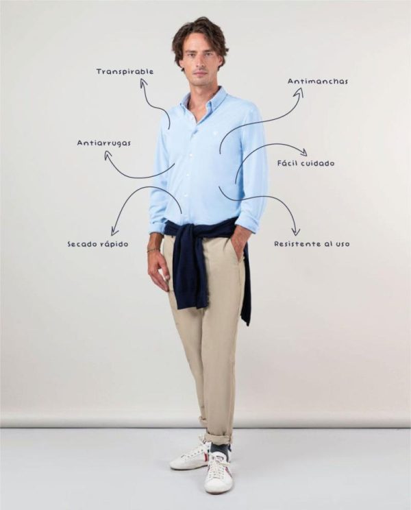 Camisa de hombre lisa con tecnología Sepiia confeccionada en 100% poliéster técnico antibacteriano reciclable.
